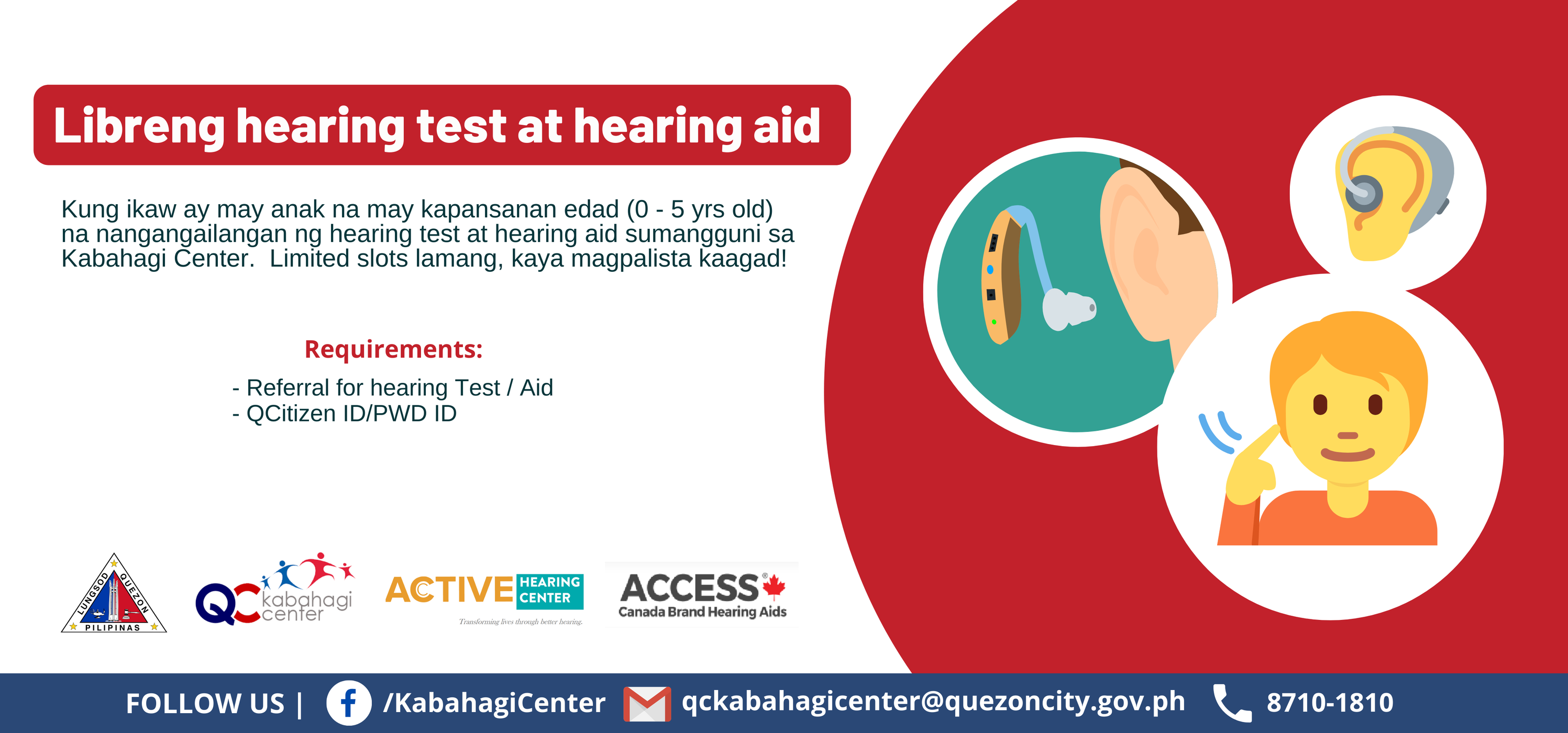Kung ang inyong anak ay nasa edad 0-5 years old at hirap sa pandinig, makipag-ugnayan sa QC Kabahagi Center for Children with Disabilities at magpalista. Dalhin din ang mga sumusunod na requirements: