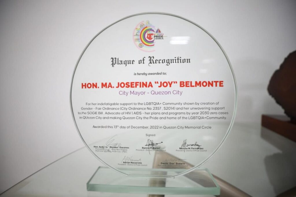 Iginawad kay Mayor Joy Belmonte ang plaque of appreciation mula sa QC Rainbow Pride Council sa pangunguna ng presidente nito na si Kap. Anthony “Don don” Dacones sa ginanap na QC Rainbow Pride Council Christmas Gala Night.