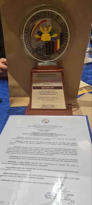 Kinilala ng Philippine Statistics Authority ang Quezon City dahil sa pagsasagawa ng Community-Based Monitoring System sa ginanap na PSA-NCR Stakeholders’ Forum noong October 24, 2023.
