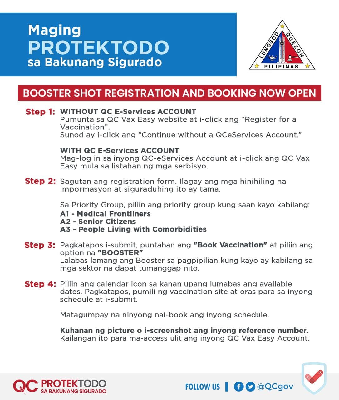Para sa mga kabilang sa A1 hanggang A3 priority groups na nais magpabakuna ng booster shot, narito ang gabay sa pagrehistro sa ating QC Vax Easy Plus (https://qceservices.quezoncity.gov.ph/qcvaxeasy)