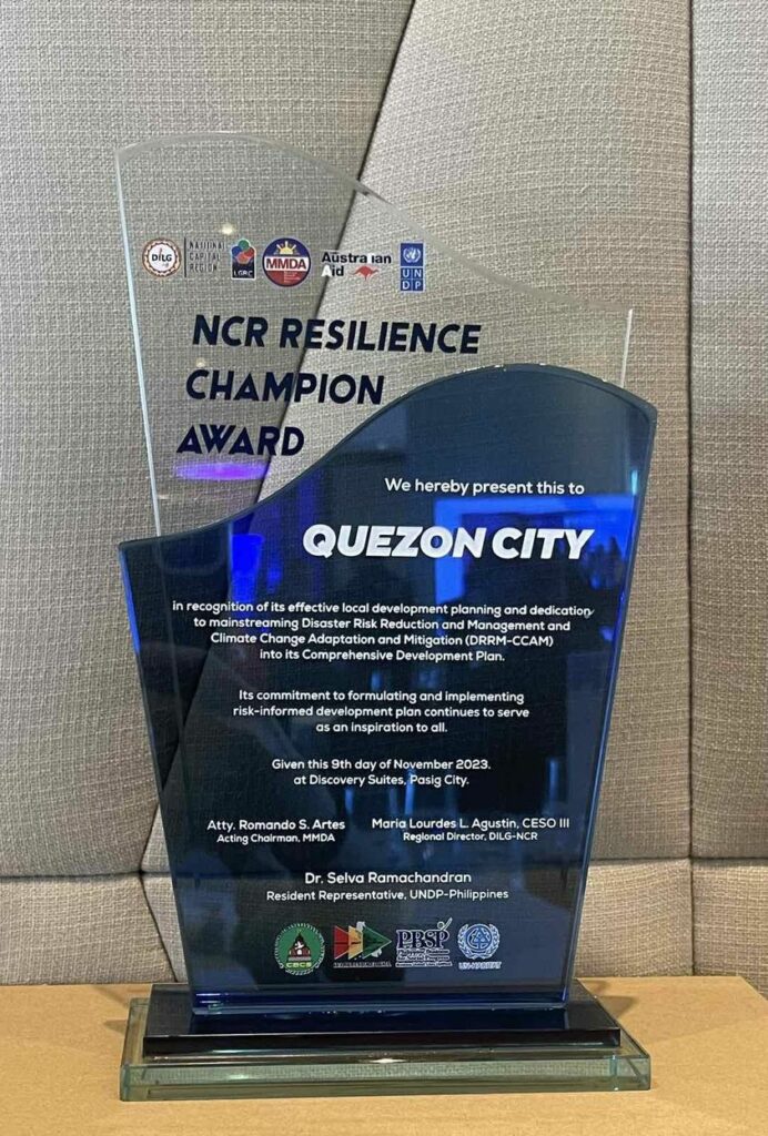 Nakamit ng Lungsod Quezon ang NCR Resilience Champion Award mula sa Department of the Interior and Local Government (DILG), Metro Manila Development Authority (MMDA), at United Nations Development Programme Philippines (UNDP PH).
