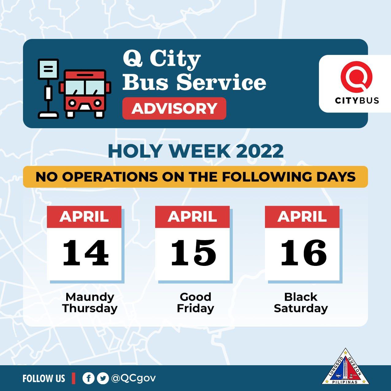 Wala pong biyahe ang Q City Bus sa April 14, 15 at 16, 2022 ( Maundy Thursday, Good Friday, and Black Saturday).