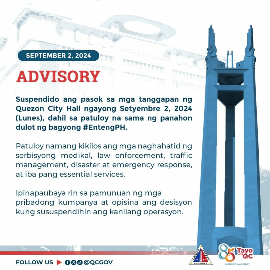 Suspendido ang pasok sa mga tanggapan ng Quezon City Hall ngayong Setyembre 2, 2024 (Lunes), dahil sa patuloy na sama ng panahon dulot ng bagyong #EntengPH.