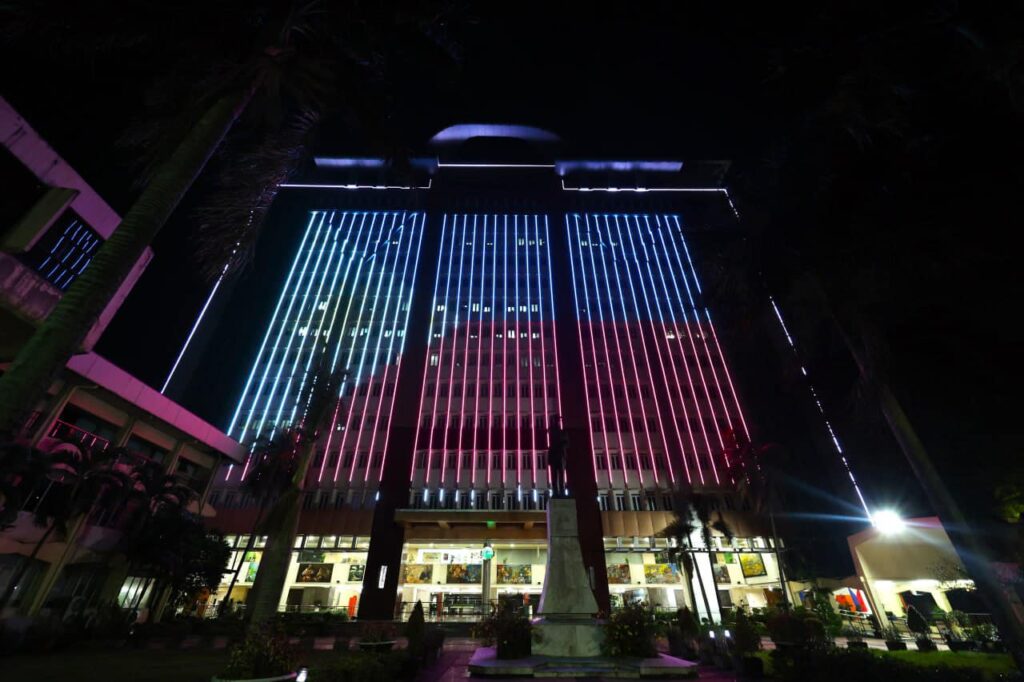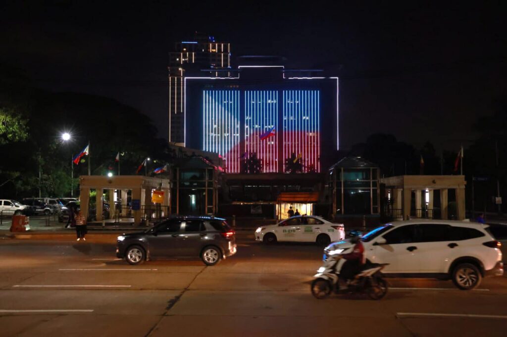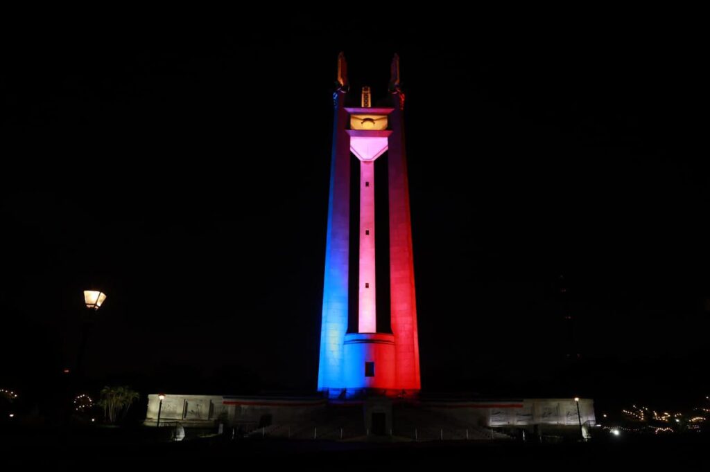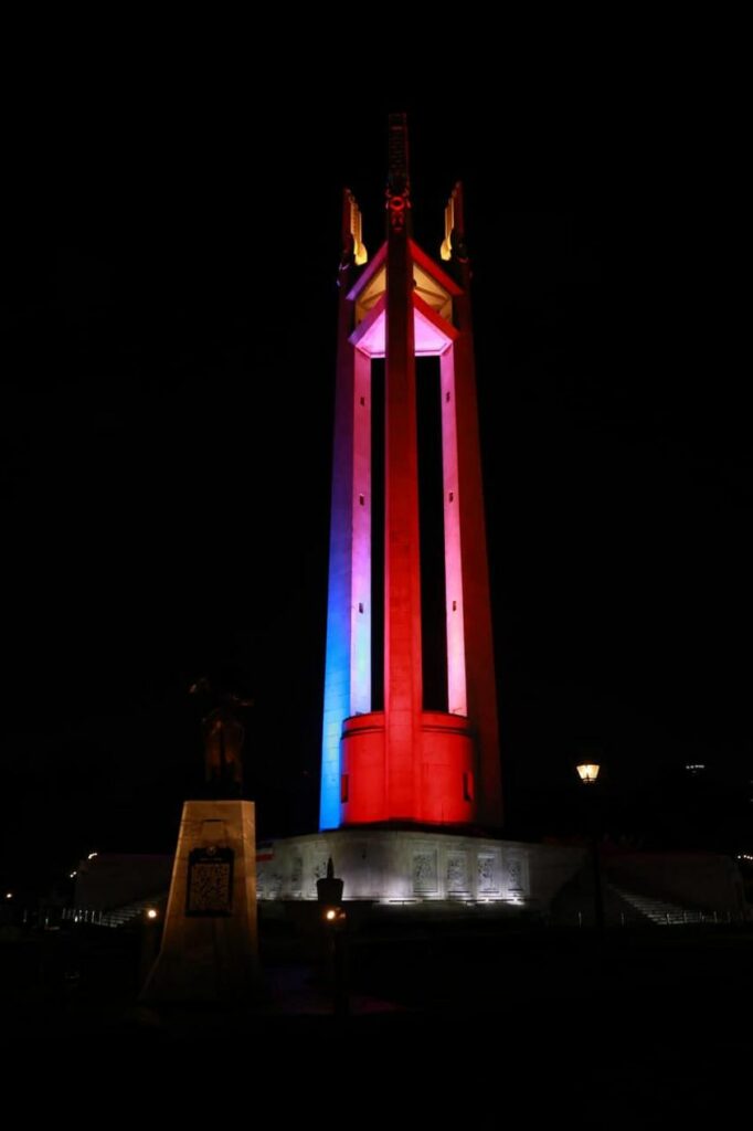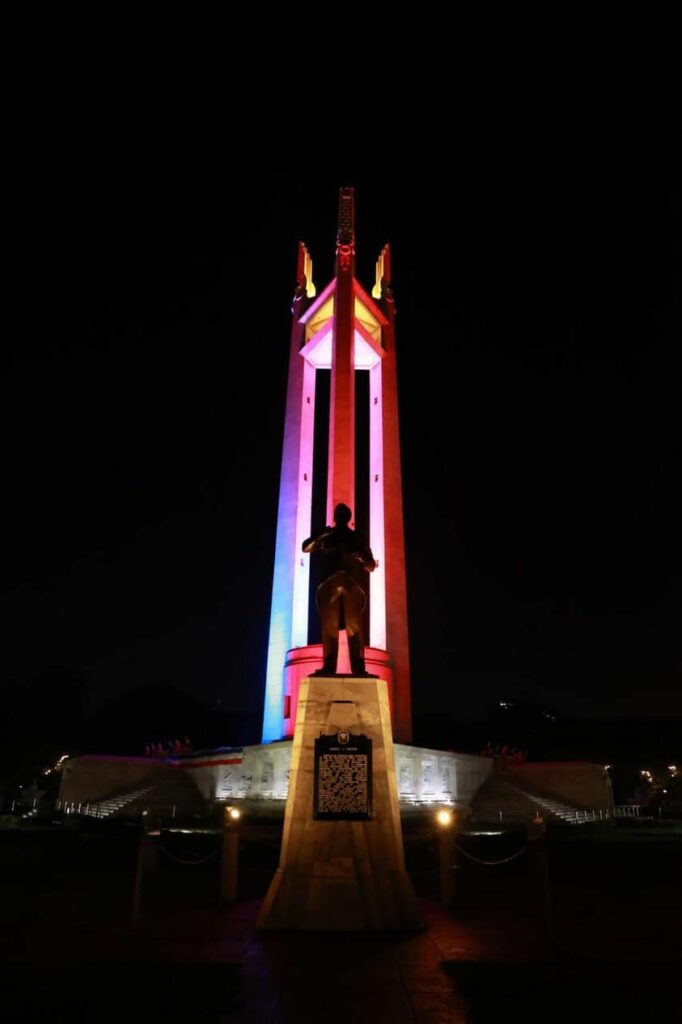 Inilawan ng kulay ng bandila ng Pilipinas (asul at pula) ang Quezon Shrine (Pylon) sa Quezon Memorial Circle at Highrise building ng Quezon City Hall bilang pakikiisa sa National Flag Day.