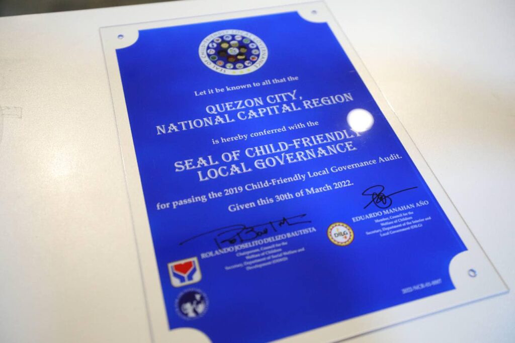 Ginawaran ng Department of the Interior and Local Government (DILG) at Department of Social Welfare and Development (DSWD) ng Seal of Child-Friendly Local Governance ang Quezon City bilang pagkilala sa pagbibigay importansya ng lungsod sa karapatan ng mga batang QCitizen.