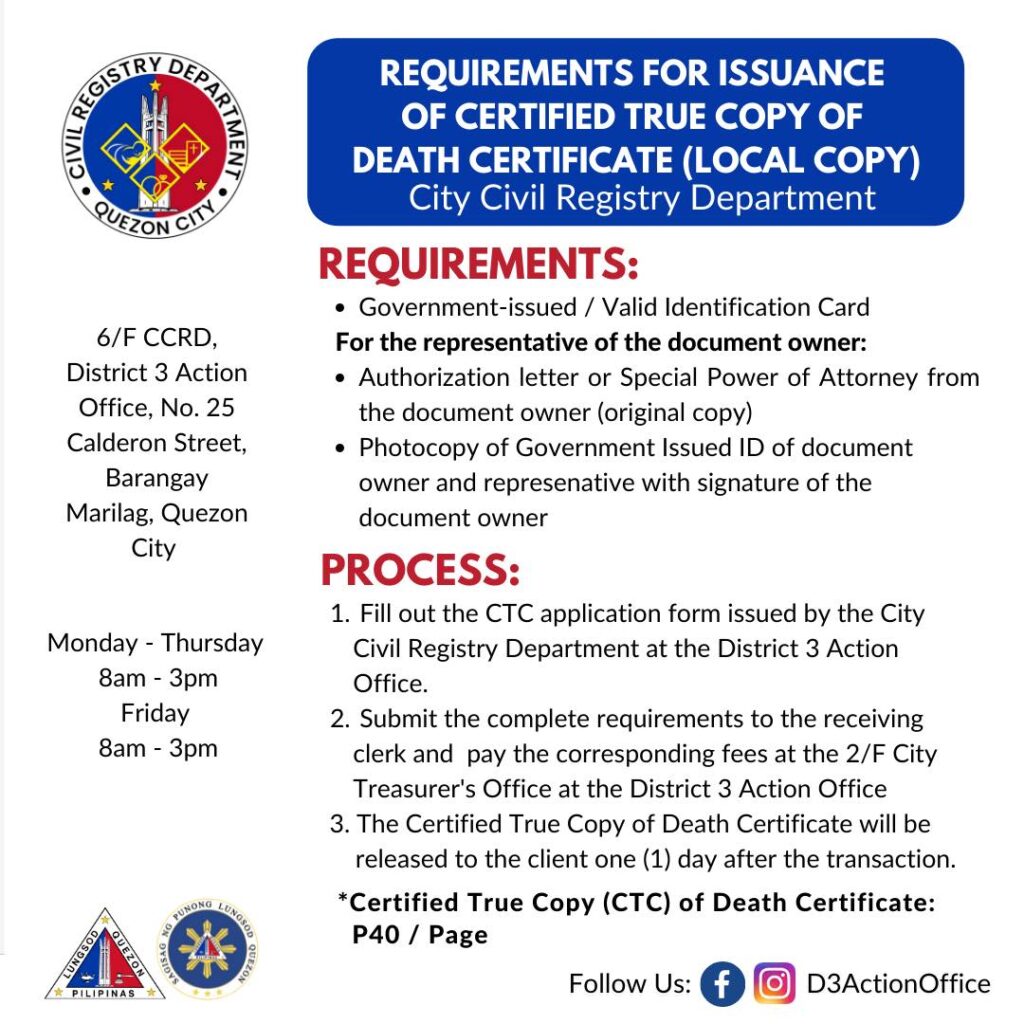 Bukas ang City Civil Registry Department (CCRD) sa District 3 Action Office para nangangailangan ng Certified True Copy of Death Certificate (local copy).