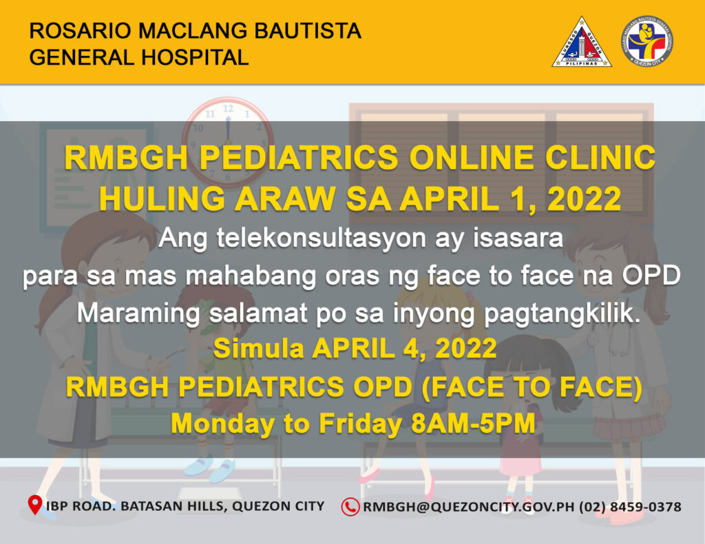 Magsisimula sa April 4, 2022 ang RMBGH Pediatrics OPD (Face-to-Face) mula Monday hanggang Friday, 8:00 AM – 5:00 PM.