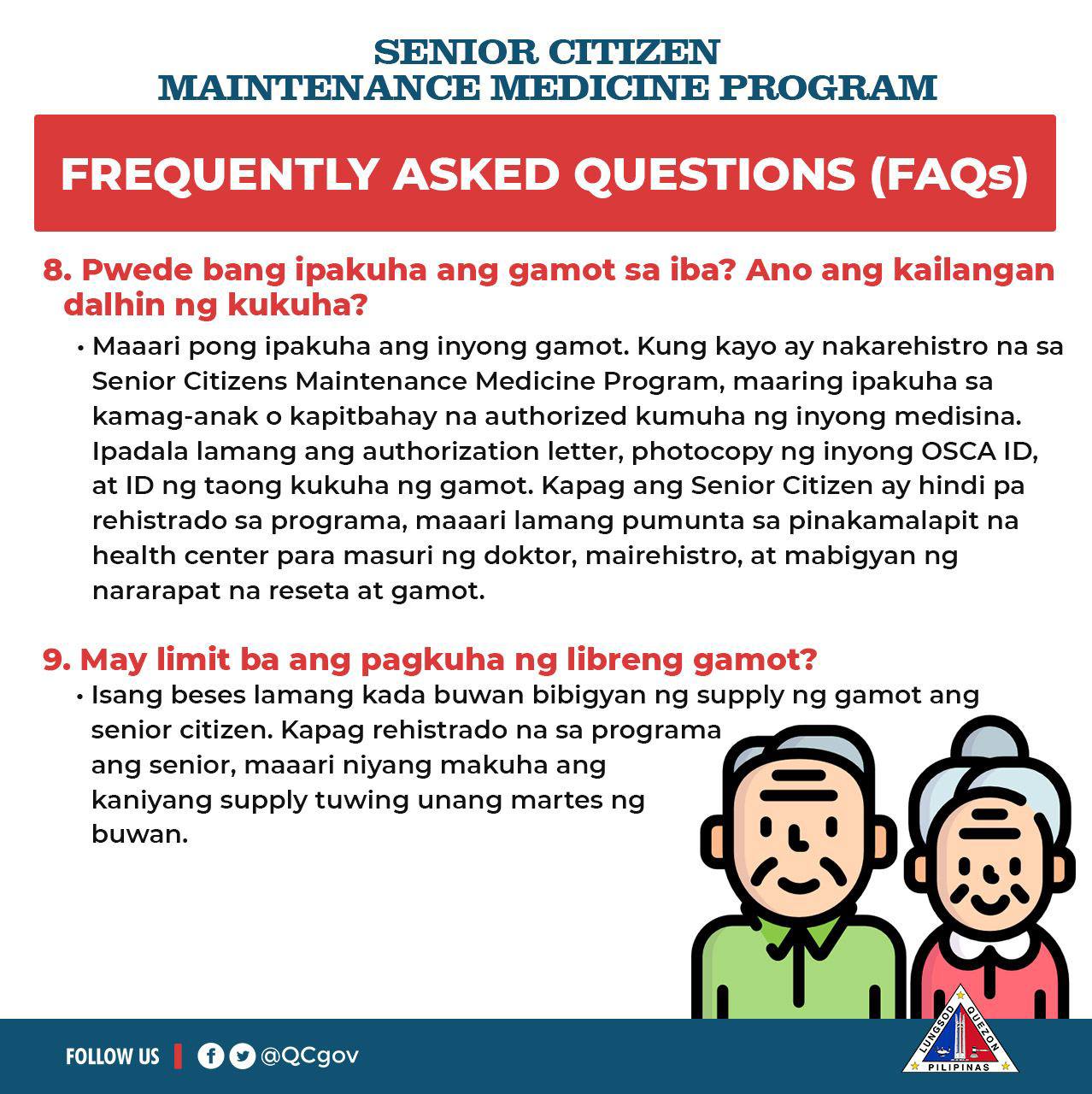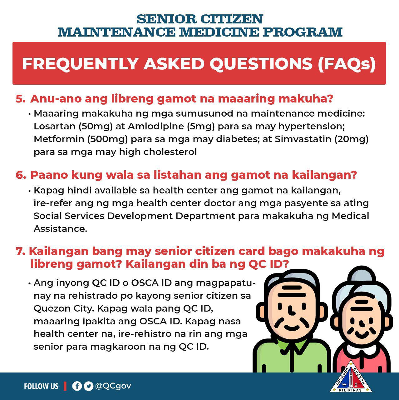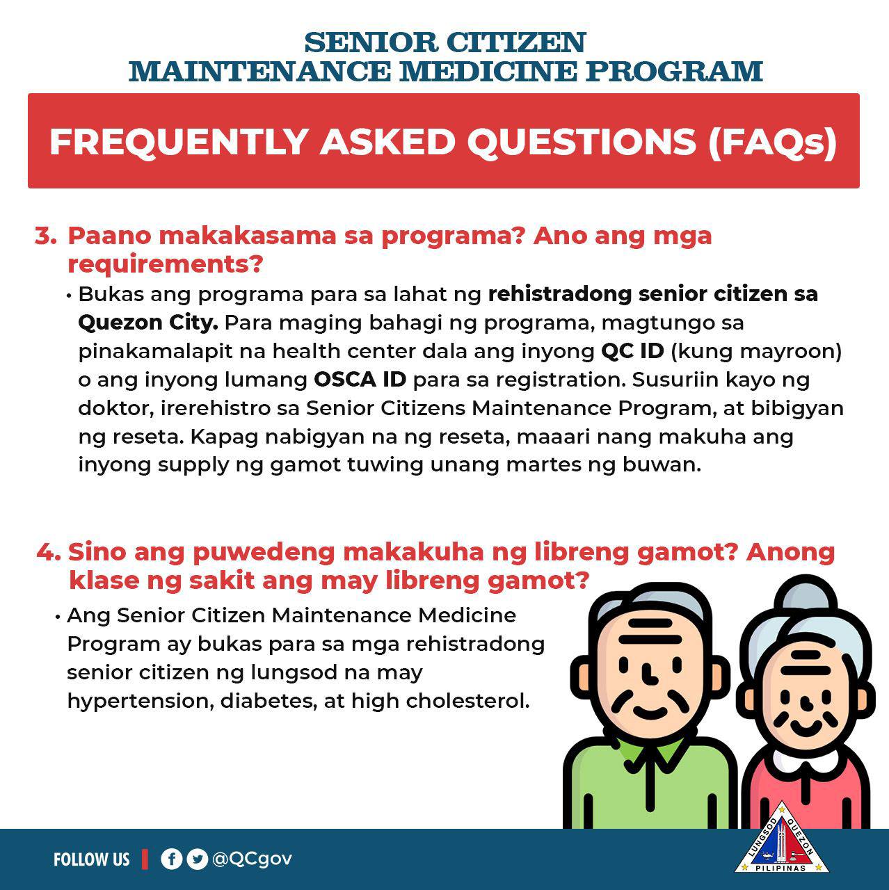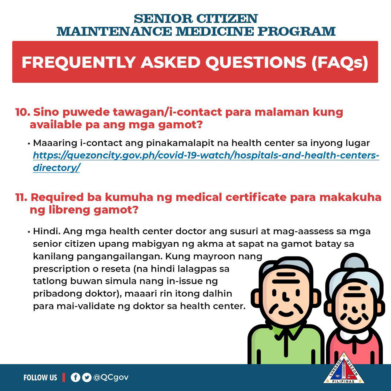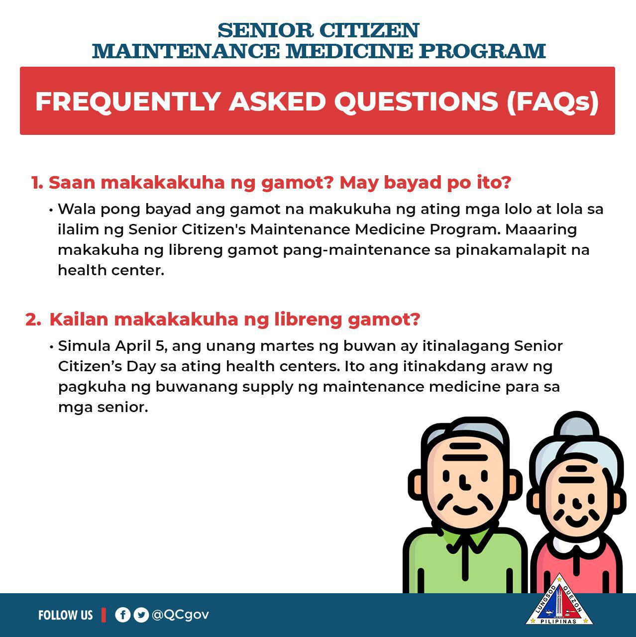 Para sa inyong mga katanungan, basahin ang mga susumunod na impormasyon at Frequently Asked Questions (FAQs) tungkol sa Senior Citizen’s Maintenance Medicine Program: