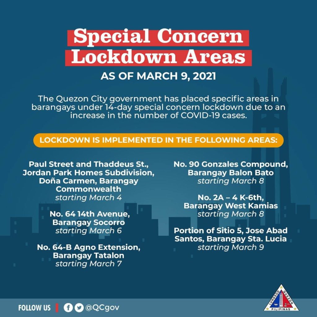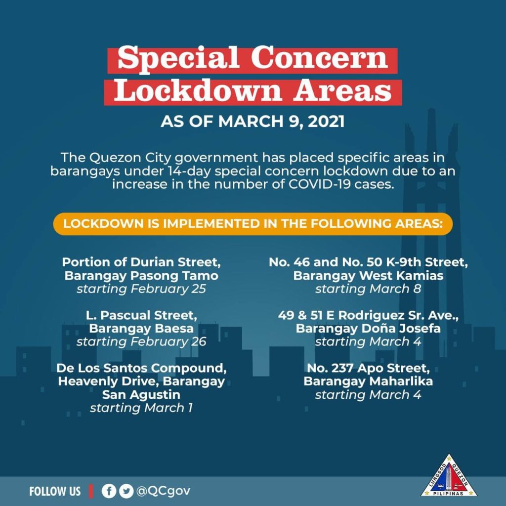Nasa ilalim ng Special Concern Lockdown Areas ang mga sumusunod na lugar sa ating lungsod dahil sa pagtaas ng bilang ng kaso ng COVID-19.