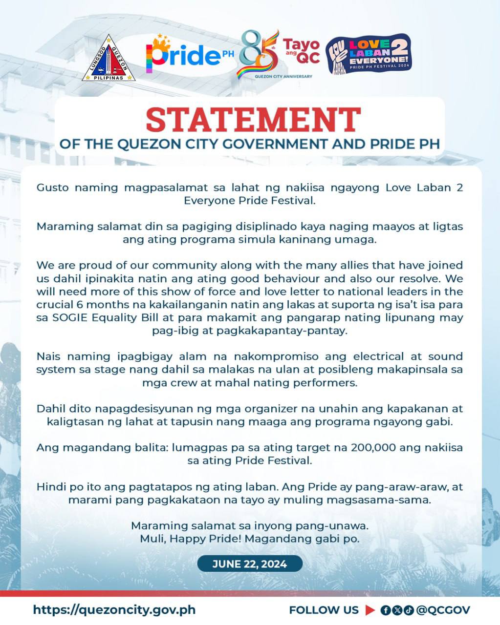 Nais naming ipagbigay alam na nakompromiso ang electrical at sound system sa stage nang dahil sa malakas na ulan at posibleng makapinsala sa mga crew at mahal nating performers.