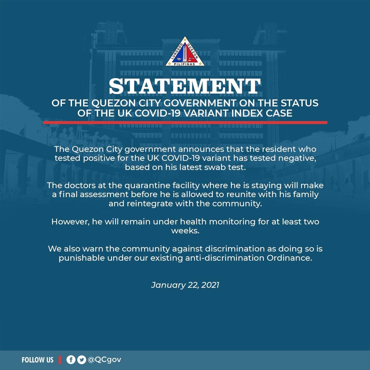 The Quezon City government announces that the resident who tested positive for the UK COVID-19 variant has tested negative, based on his latest swab test.