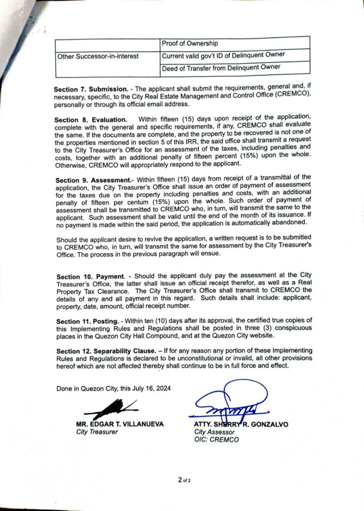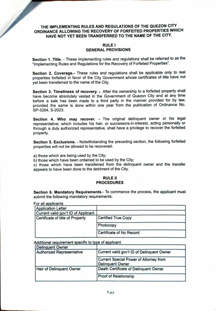 Home » Media » Latest News » THE IMPLEMENTING RULES AND REGULATIONS OF THE QUEZON CITY ORDINANCE ALLOWING THE RECOVERY OF FORFEITED PROPERTIES WHICH HAVE NOT YET BEEN TRANSFERRED TO THE NAME OF THE CITY