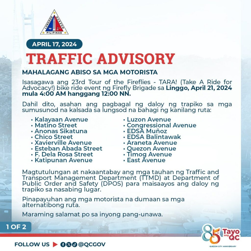 Isasagawa ang 23rd Tour of the Fireflies – TARA! (Take A Ride for Advocacy!) bike ride event ng Firefly Brigade sa Linggo, April 21, 2024 mula 4:00 AM hanggang 12:00 NN.