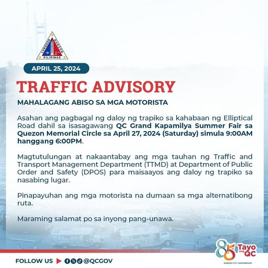 Asahan ang pagbagal ng daloy ng trapiko sa kahabaan ng Elliptical Road dahil sa isasagawang QC Grand Kapamilya Summer Fair sa Quezon Memorial Circle sa April 27, 2024 (Saturday) simula 9:00AM hanggang 6:00PM.