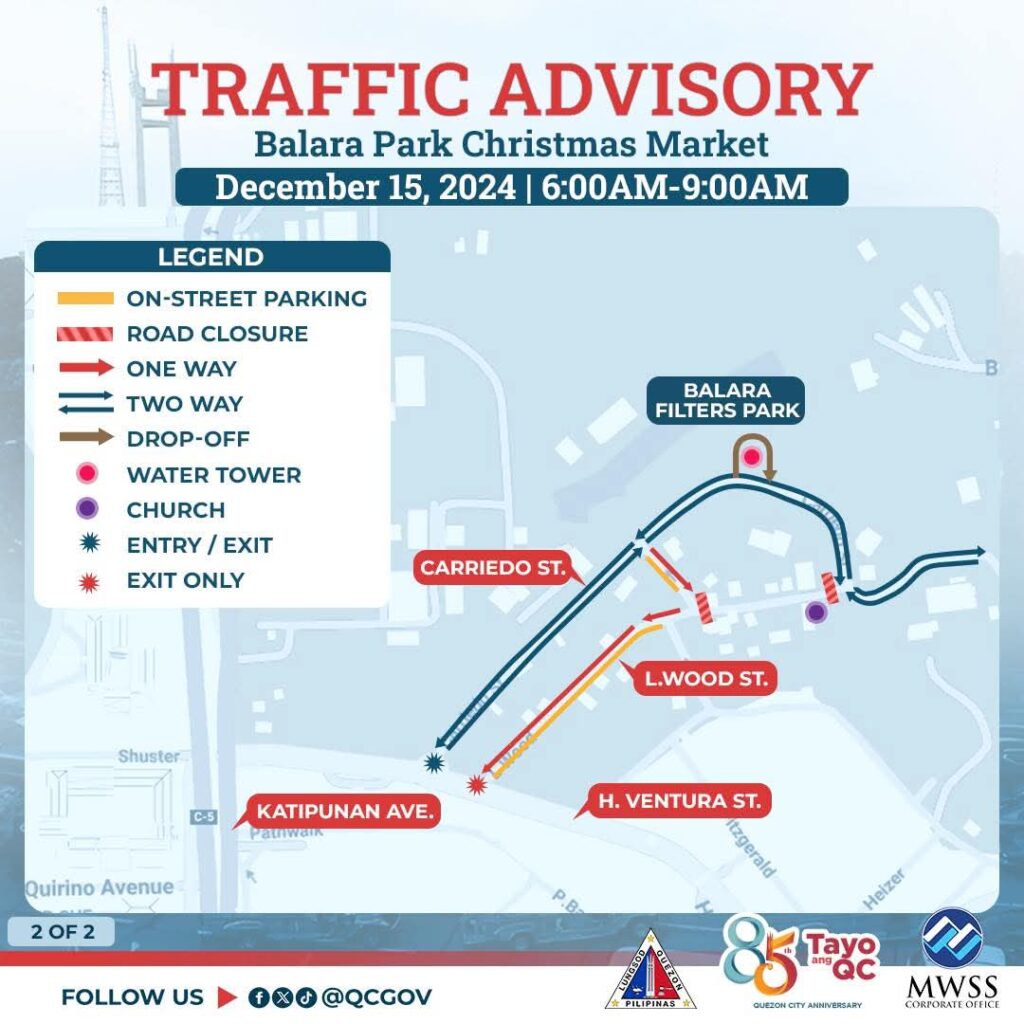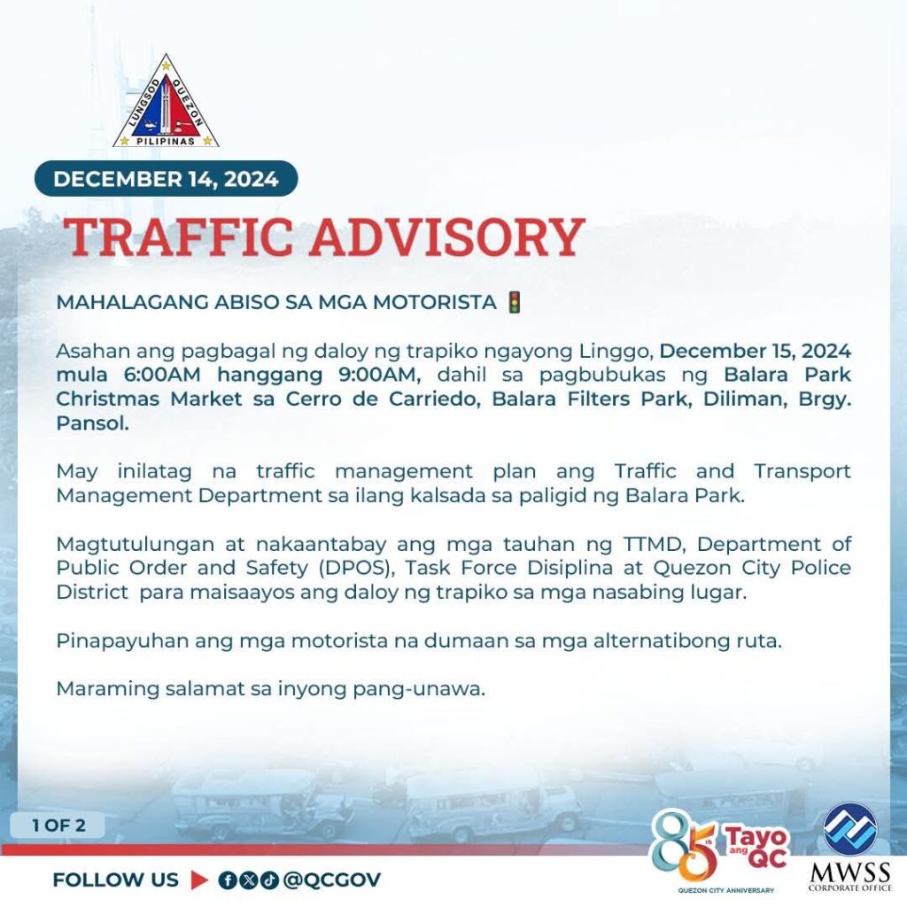 Asahan ang pagbagal ng daloy ng trapiko ngayong Linggo, December 15, 2024 mula 6:00AM hanggang 9:00AM, dahil sa pagbubukas ng Balara Park Christmas Market sa Cerro de Carriedo, Balara Filters Park, Diliman, Brgy. Pansol.