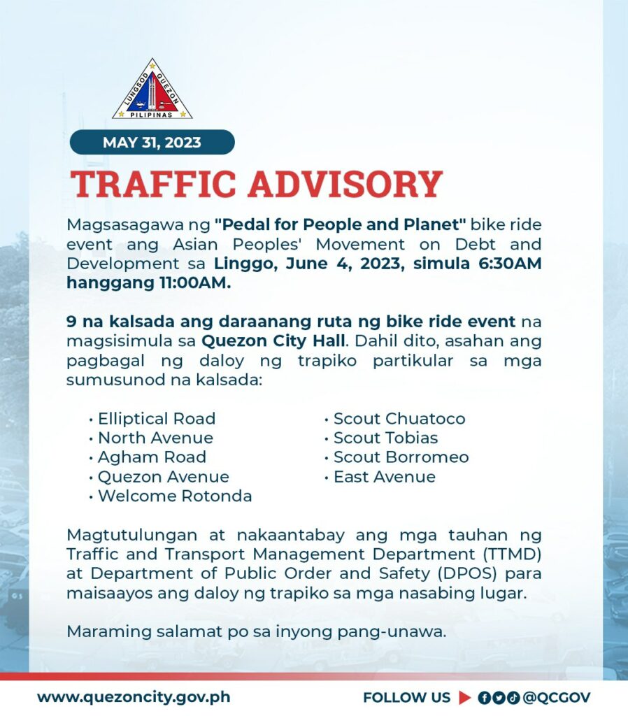 9 na kalsada ang daraanang ruta ng bike ride event na magsisimula sa Quezon City Hall. Dahil dito, asahan ang pagbagal ng daloy ng trapiko partikular sa mga sumusunod na kalsada:
