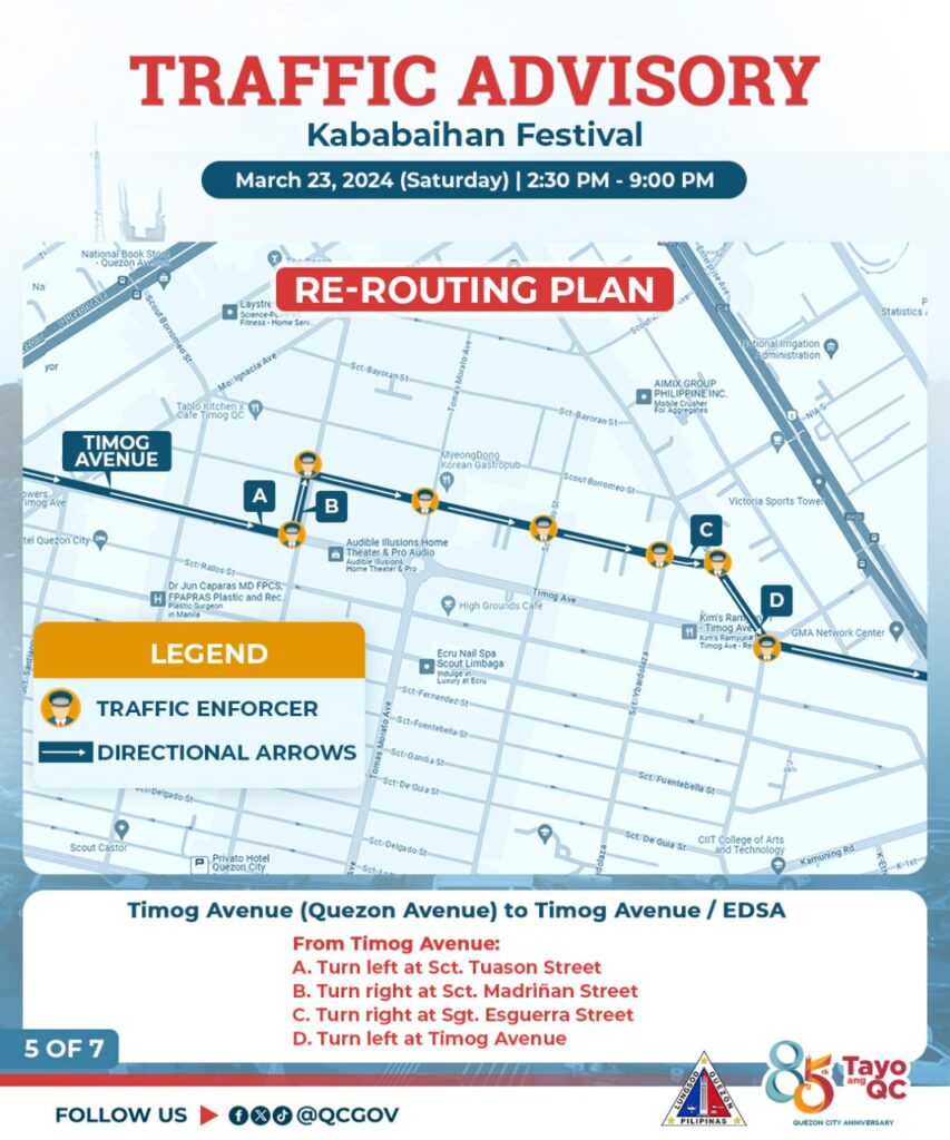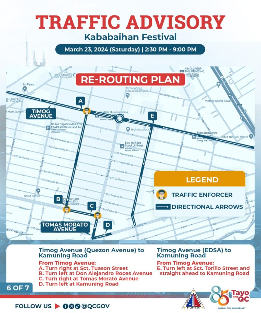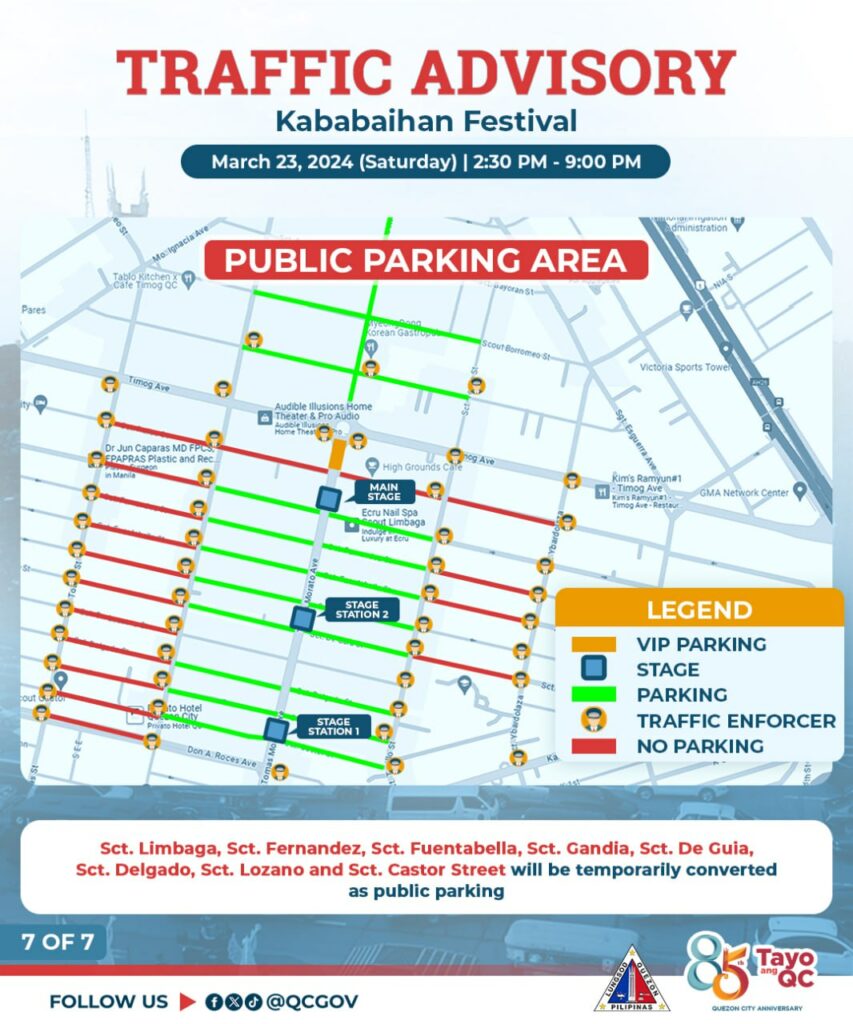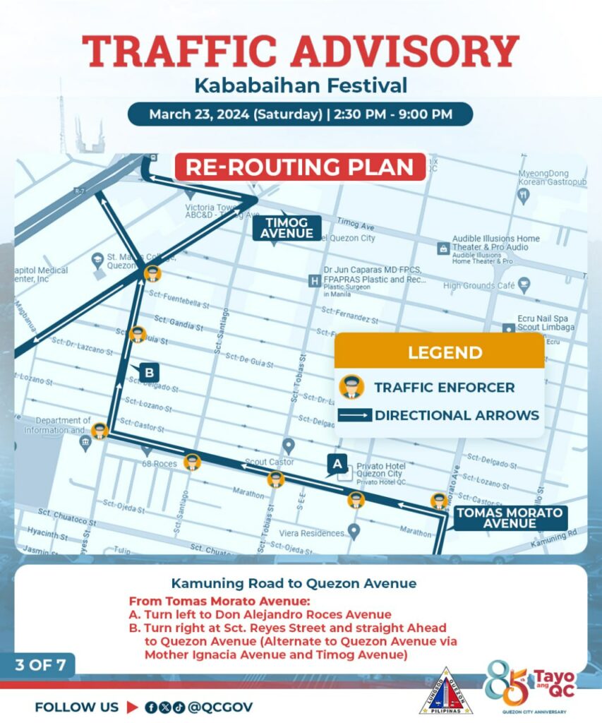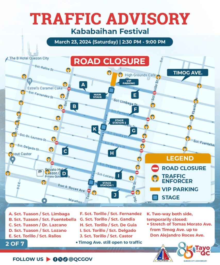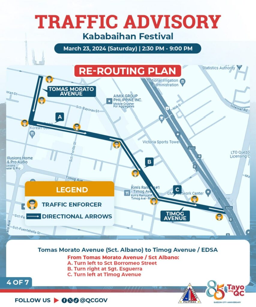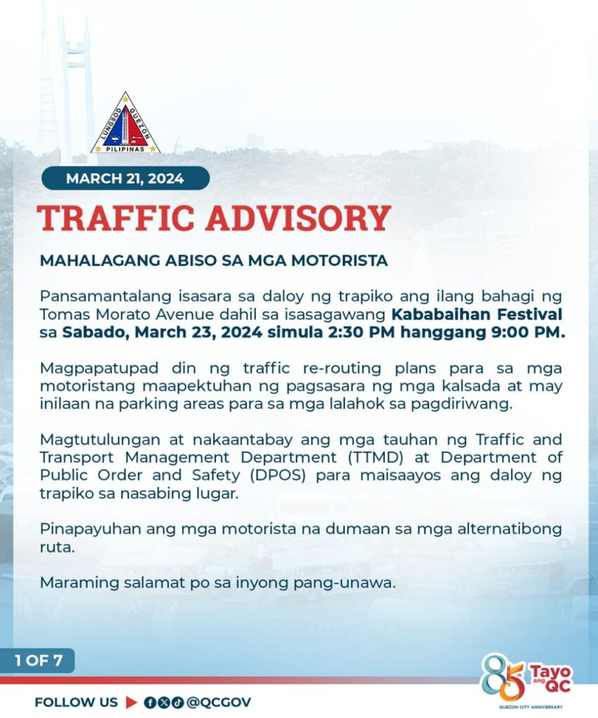 Pansamantalang isasara sa daloy ng trapiko ang ilang bahagi ng Tomas Morato Avenue bukas, Sabado, March 23, 2024 simula 2:30 PM hanggang 9:00 PM dahil sa isasagawang Kababaihan Festival Celebration.