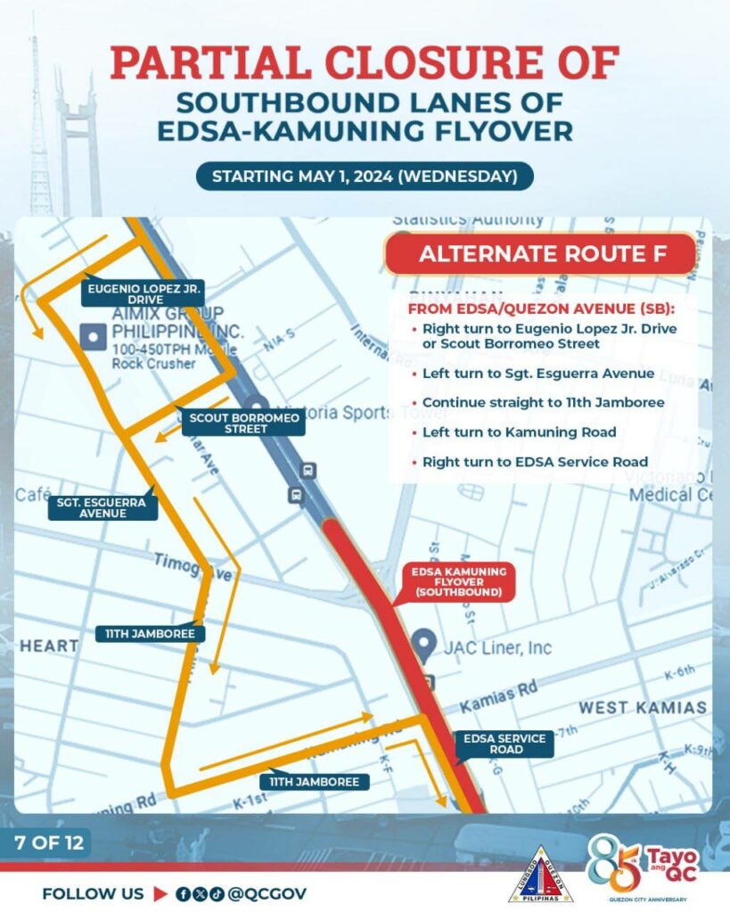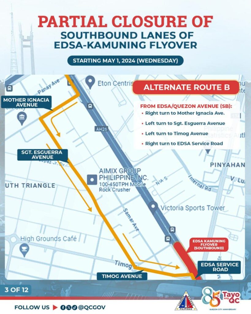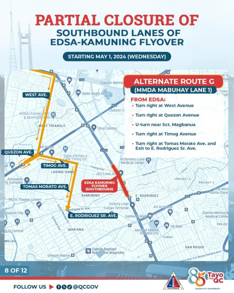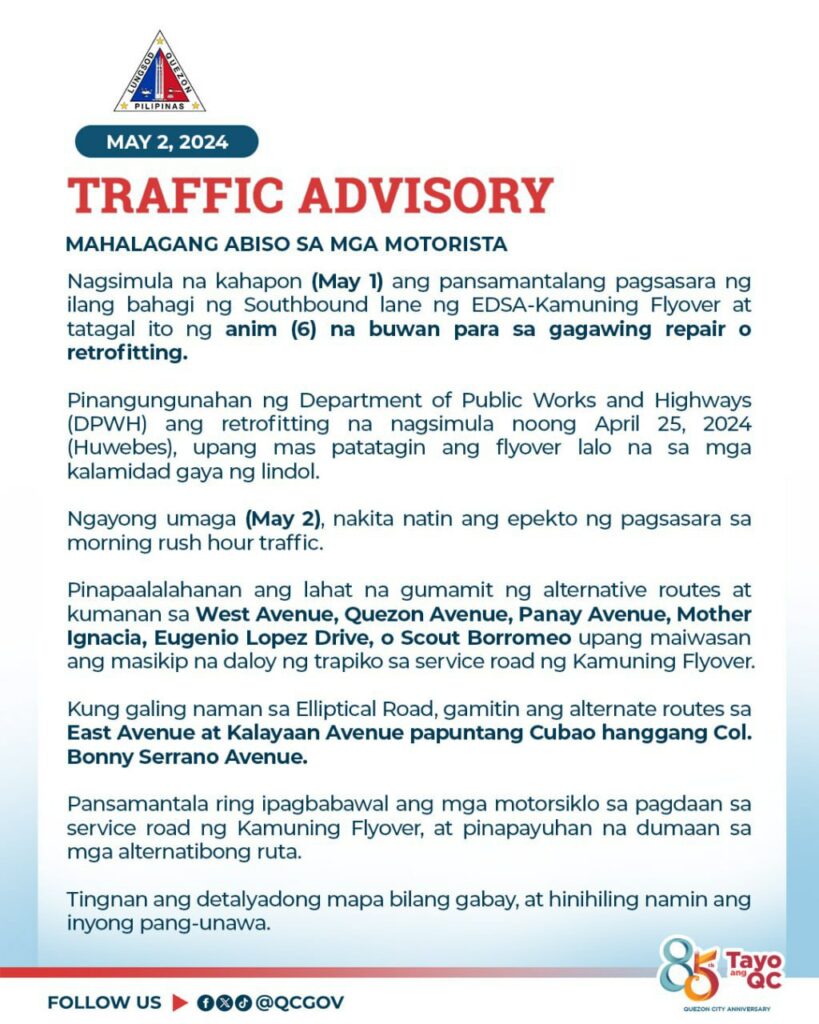 Pinapaalalahanan ang lahat na gumamit ng alternative routes at kumanan sa West Avenue, Quezon Avenue, Panay Avenue, Mother Ignacia, Eugenio Lopez Drive, o Scout Borromeo upang maiwasan ang masikip na daloy ng trapiko sa service road ng Kamuning Flyover.