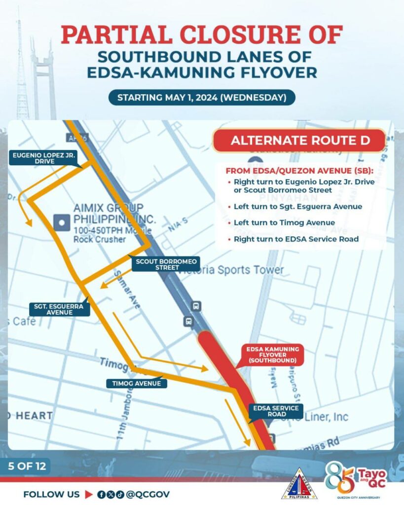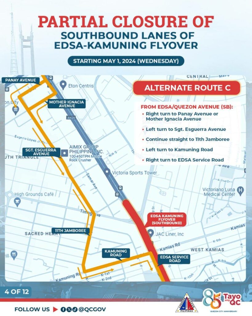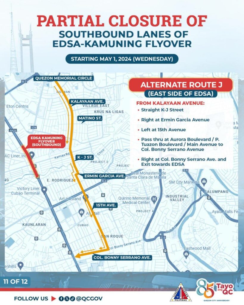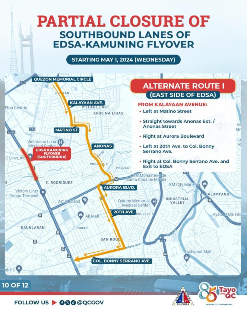 Pinapaalalahanan ang lahat na gumamit ng alternative routes at kumanan sa West Avenue, Quezon Avenue, Panay Avenue, Mother Ignacia, Eugenio Lopez Drive, o Scout Borromeo upang maiwasan ang masikip na daloy ng trapiko sa service road ng Kamuning Flyover.