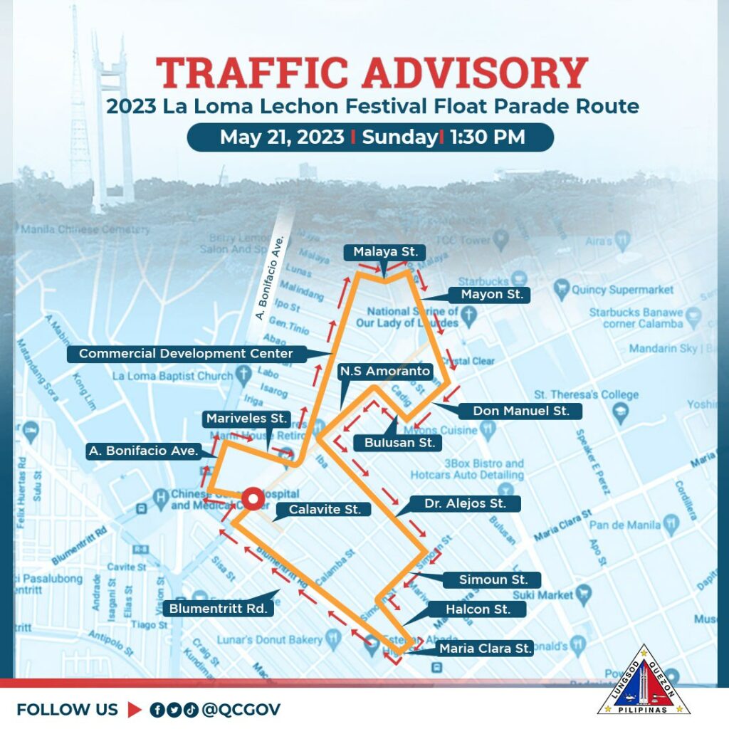 Asahan ang pagbagal ng daloy ng trapiko partikular sa mga sumusunod na kalsada na pagdarausan ng 2023 La Loma Lechon Festival Float Parade sa May 21, 2023 (Sunday), 1:30PM: