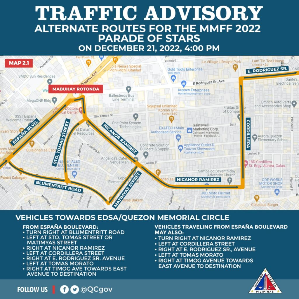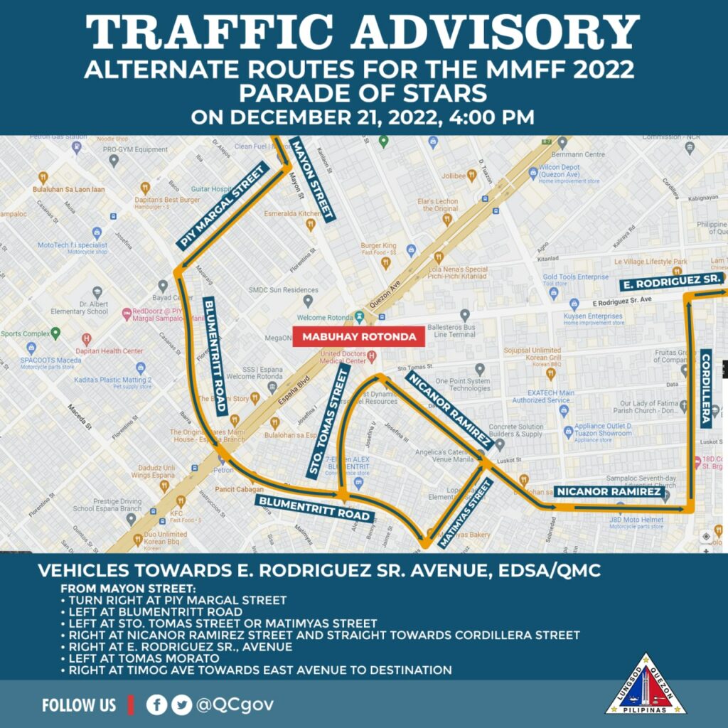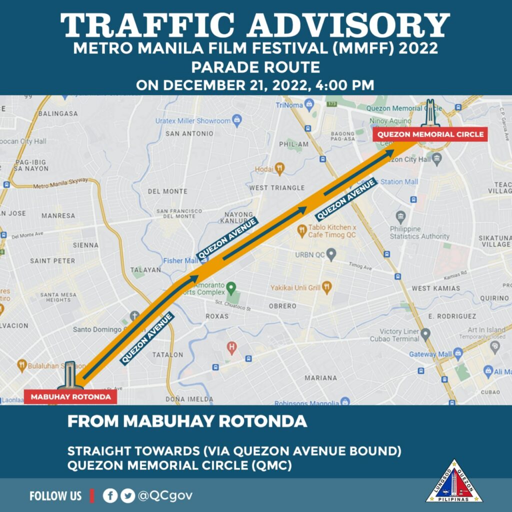 Sa gabi ng December 20 (Tuesday), iwasan ang E. Rodriguez Avenue mula Banawe hanggang Mabuhay Rotonda na magiging staging area para sa float ng mga pelikula. Sasakupin nito ang isang lane ng westbound habang bukas naman sa trapiko ang eastbound direction.