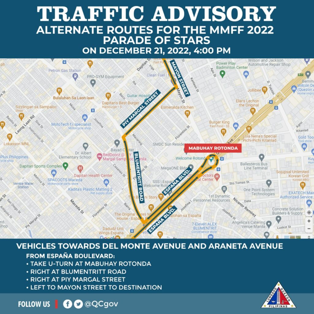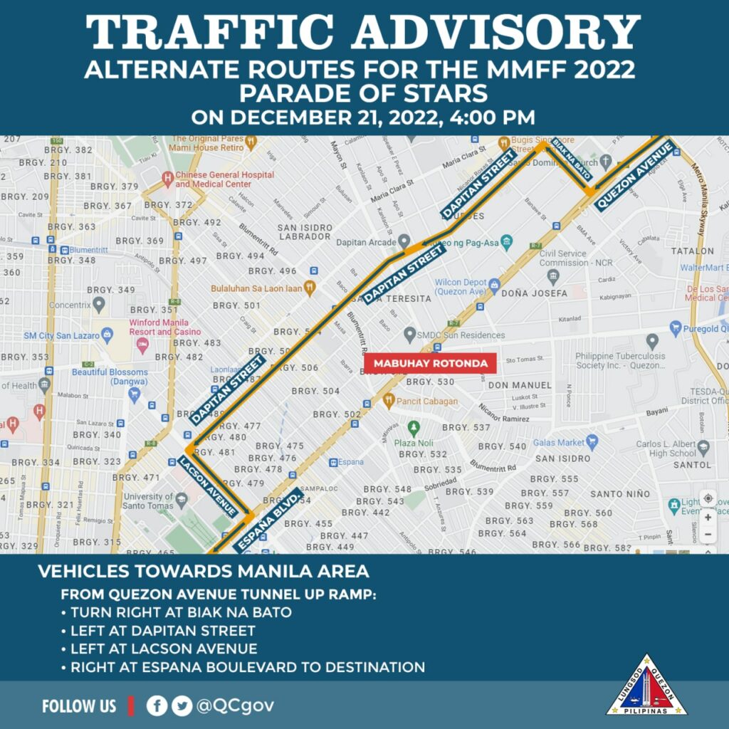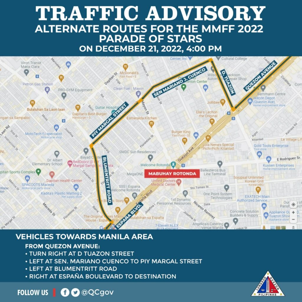 Sa gabi ng December 20 (Tuesday), iwasan ang E. Rodriguez Avenue mula Banawe hanggang Mabuhay Rotonda na magiging staging area para sa float ng mga pelikula. Sasakupin nito ang isang lane ng westbound habang bukas naman sa trapiko ang eastbound direction.