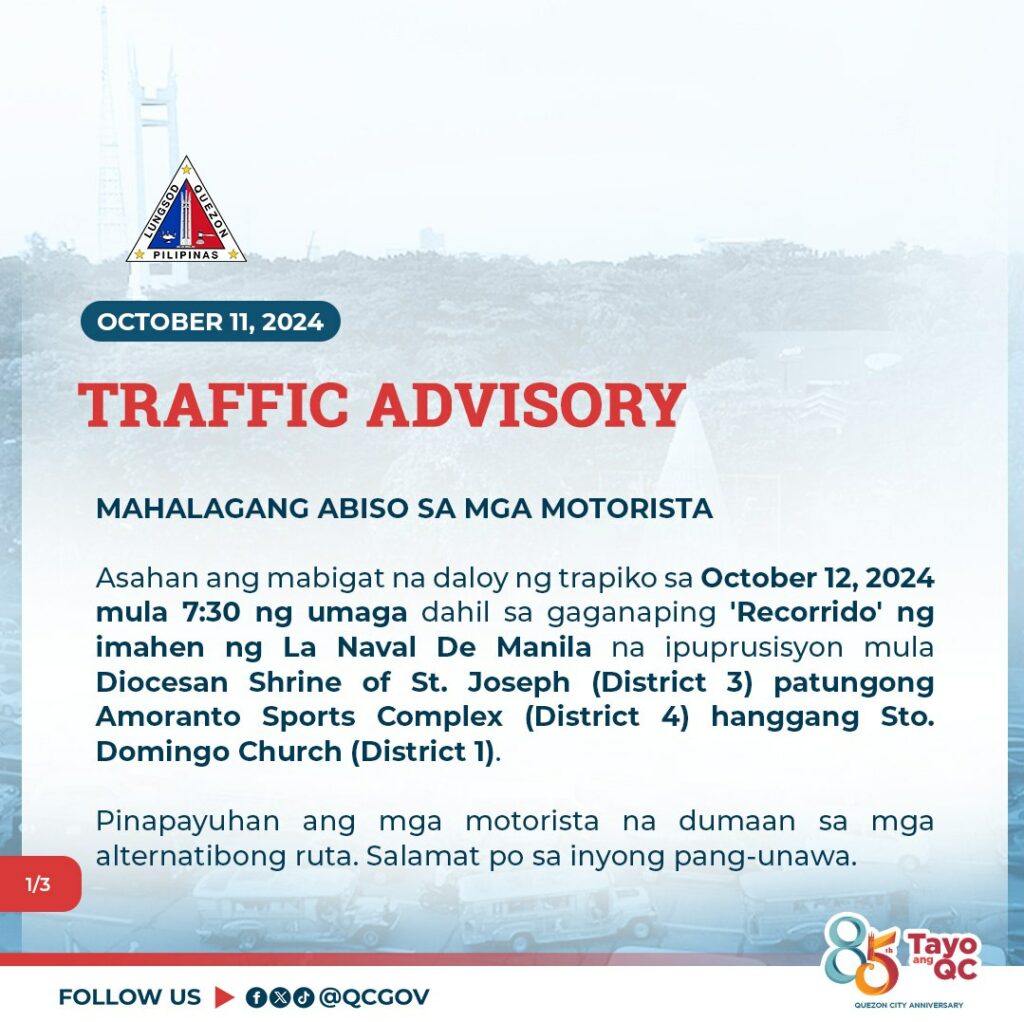 Asahan ang mabigat na daloy ng trapiko sa October 12, 2024 mula 7:30 ng umaga dahil sa gaganaping ‘Recorrido’ ng imahen ng La Naval De Manila na ipuprusisyon mula Diocesan Shrine of St. Joseph (District 3) patungong Amoranto Sports Complex (District 4) hanggang Sto. Domingo Church (District 1).