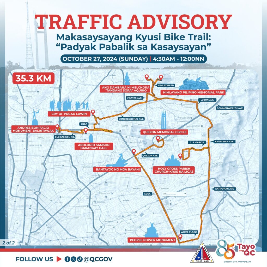 Bilang bahagi ng pagdiriwang ng ika-85 na Foundation Anniversary ng Quezon City, isasagawa ang “Makasaysayang Kyusi Bike Trail: Padyak Pabalik sa Kasaysayan” bike ride event sa Linggo, October 27, 2024, simula 4:30 AM hanggang 12:00 NN. Kaya asahan ang pagbagal ng daloy ng trapiko sa mga sumusunod na kalsada: