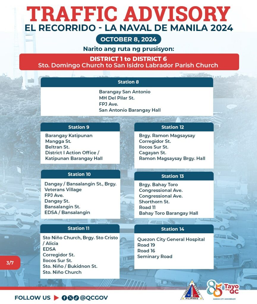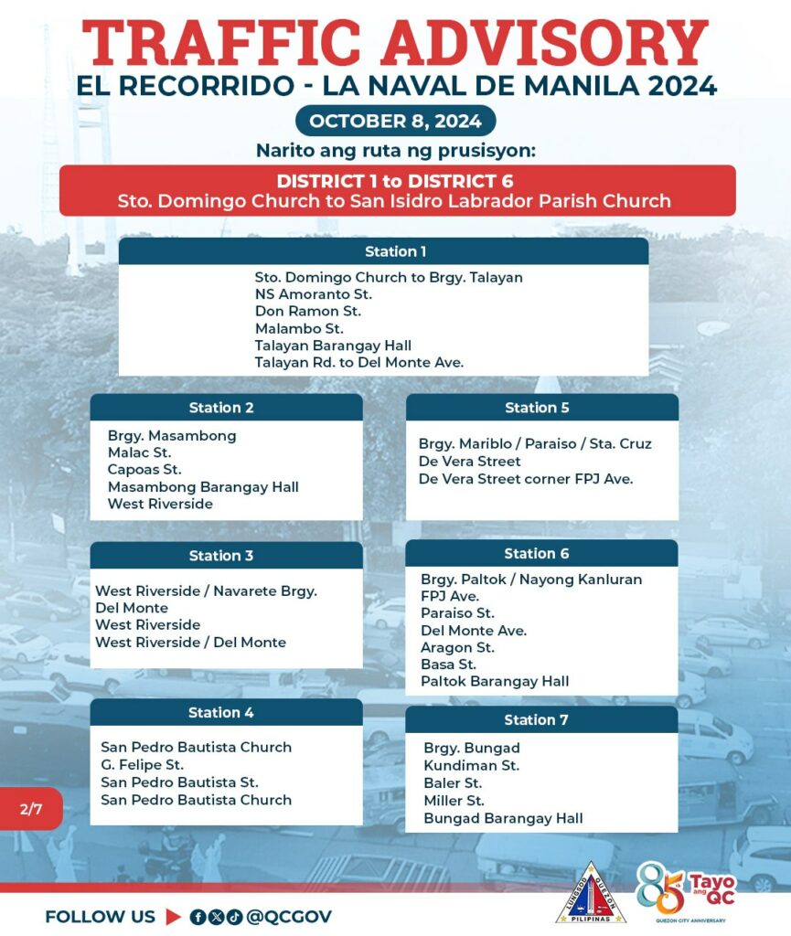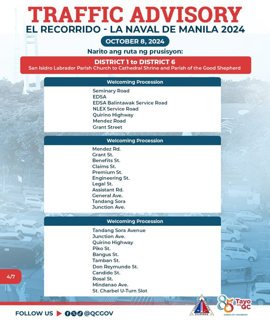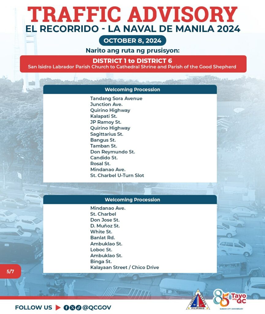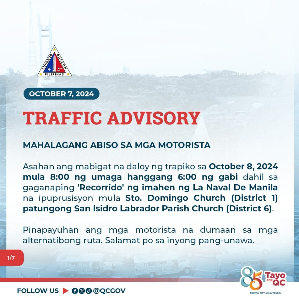 Asahan ang mabigat na daloy ng trapiko sa October 8, 2024 mula 8:00 ng umaga hanggang 6:00 ng gabi dahil sa gaganaping ‘Recorrido’ ng imahen ng La Naval De Manila na ipuprusisyon mula Sto. Domingo Church (District 1) patungong San Isidro Labrador Parish Church (District 6).
