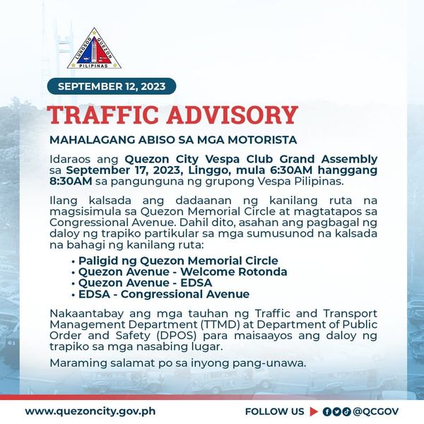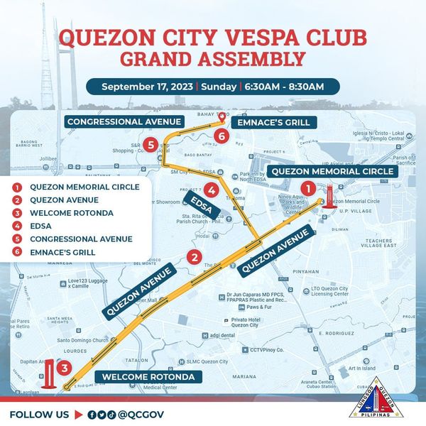Idaraos ang Quezon City Vespa Club Grand Assembly sa September 17, 2023, Linggo, mula 6:30 AM hanggang 8:30 AM sa pangunguna ng grupong Vespa Pilipinas.
