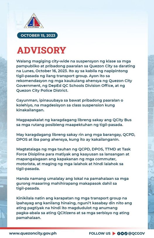 Walang magiging city-wide na suspensyon ng klase sa mga pampubliko at pribadong paaralan sa Quezon City sa darating na Lunes, October 16, 2023. Ito ay sa kabila ng napipintong tigil-pasada ng ilang transport group. Ayon ito sa rekomendasyon ng mga kaukulang ahensya ng Quezon City Government, ng DepEd QC Schools Division Office, at ng Quezon City Police District.
