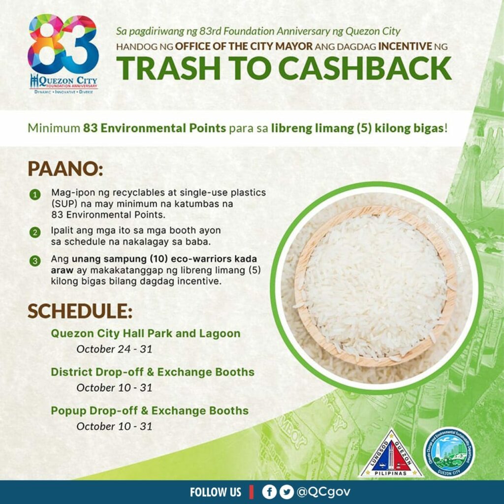 Bilang bahagi ng pagdiriwang ng ating 83rd Foundation Anniversary ng Quezon City, handog ng Office of the City Mayor ang karagdagang insentibo sa #QCTrashtoCashback ngayong Oktubre para sa inyong mga naipong recyclable materials.