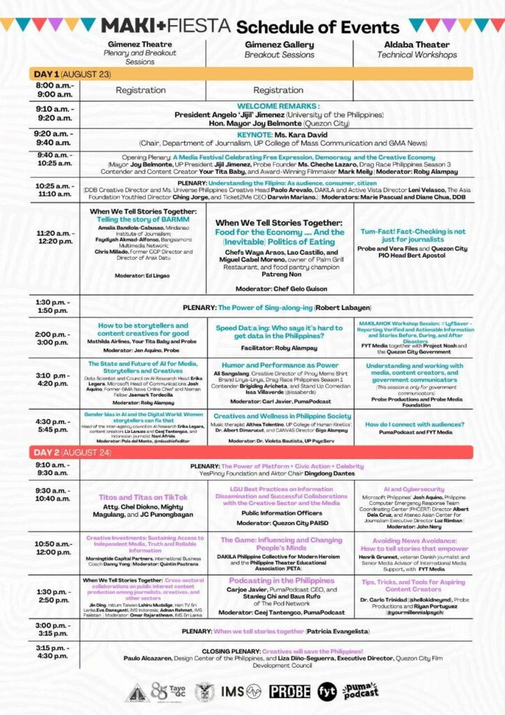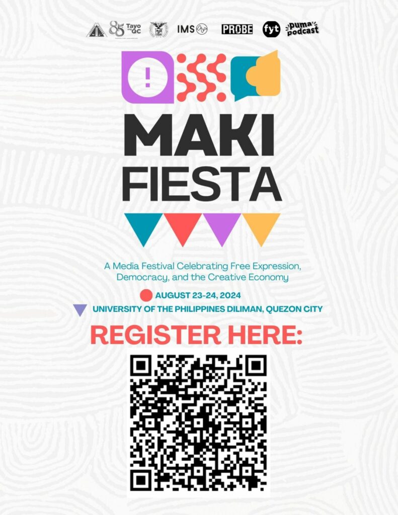 “Quezon City is home to many media companies whose impact and independence we value. At the same time, QC is, and aims to be, an engine and hub to the creative economy. This is why we are proud to be the lead partner with UP, Probe, FYT, PumaPodcast, and the International Media Support for the first MAKI+Fiesta. We are literally at the center of the festival’s message that freedom and democracy are not just values, but foundation and fuel for the innovative, creative, and economic aspirations of our people,” Mayor Joy Belmonte said.