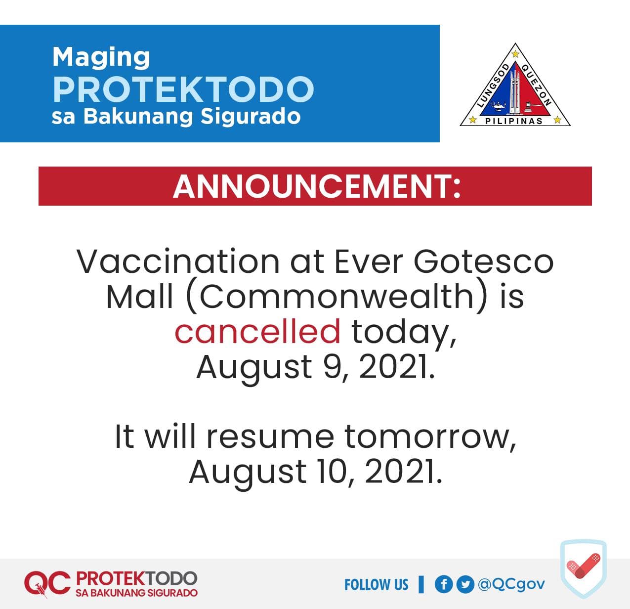 Kanselado po ang bakunahan sa Ever Gotesco Mall (Commonwealth) ngayong araw, August 9, 2021 dahil sa sunog sa warehouse ng kanilang supermarket.