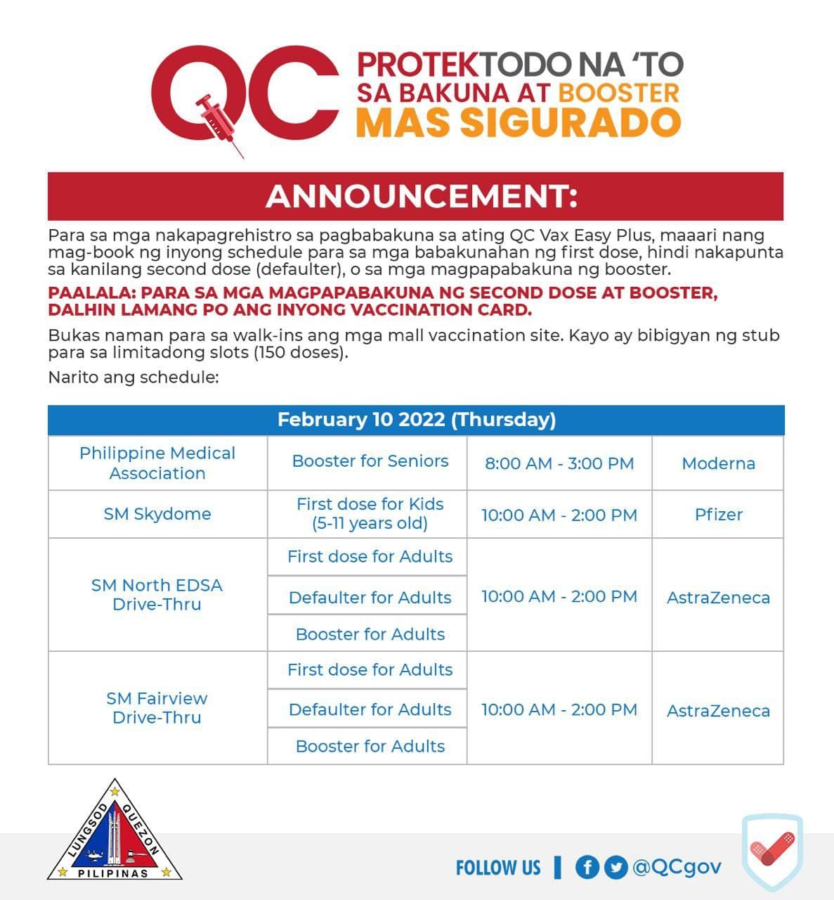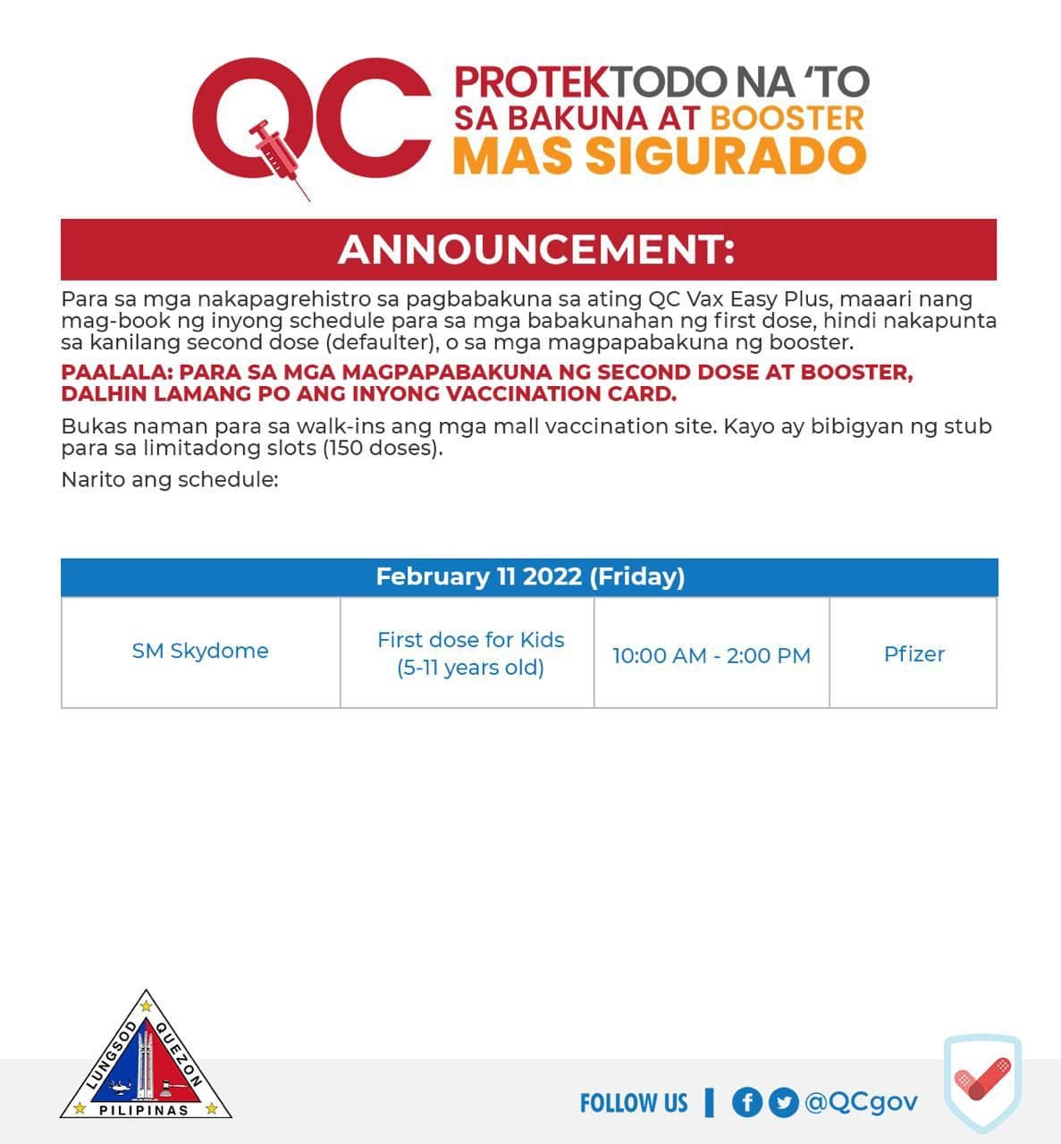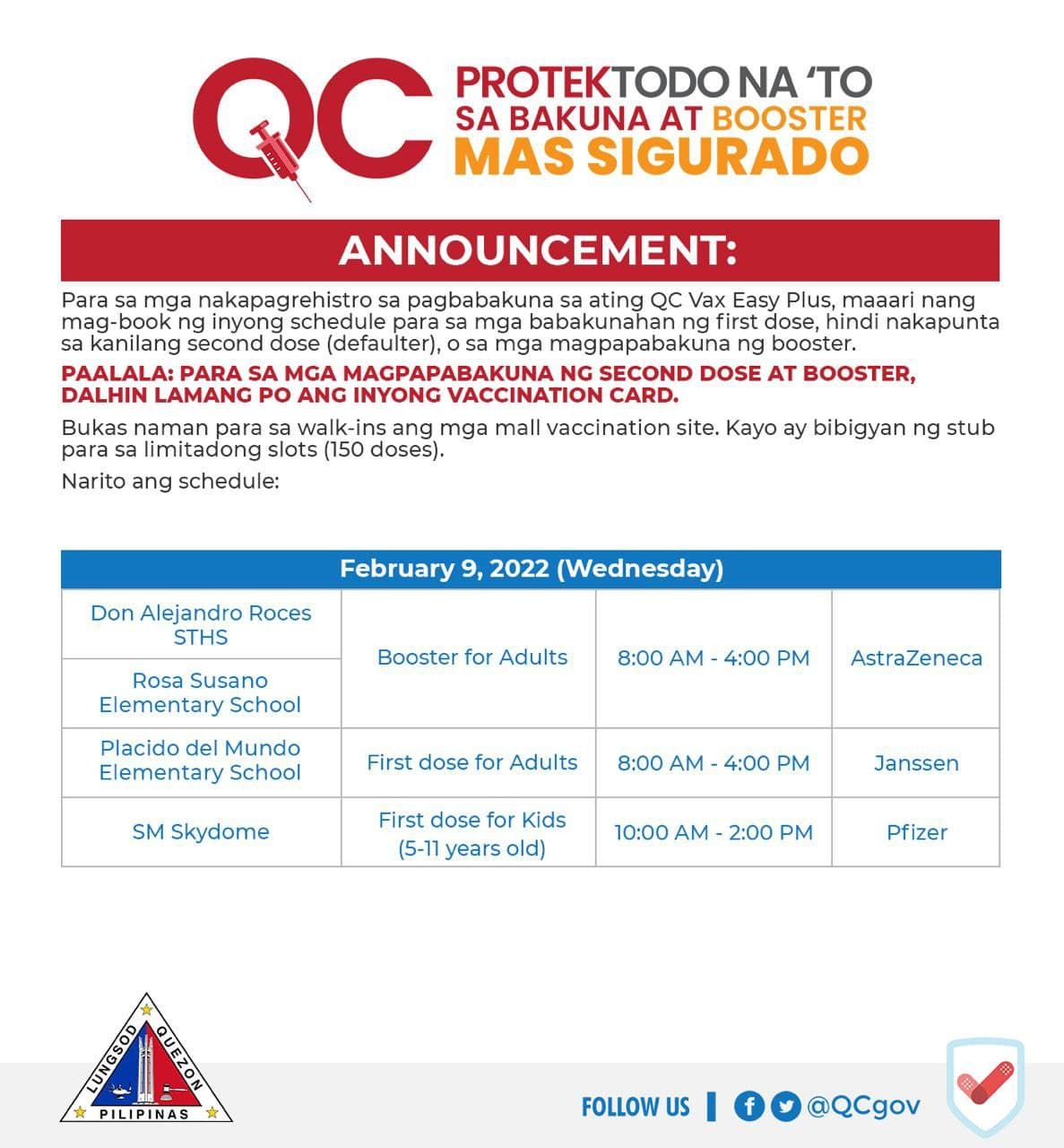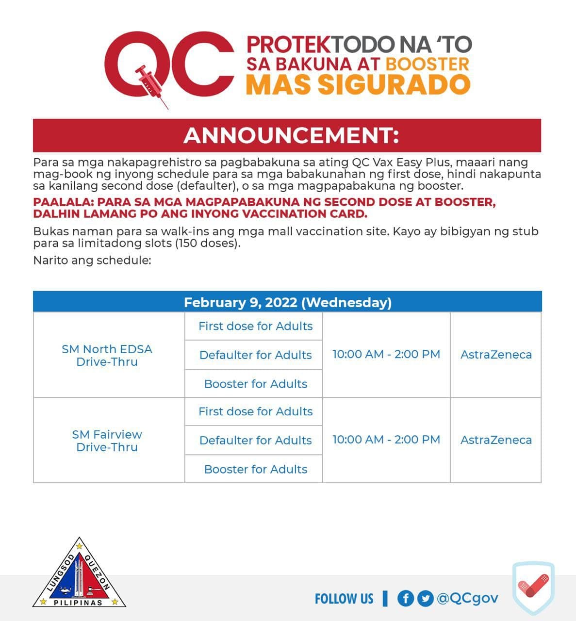 Patuloy rin ang pagbabakuna sa adult population ng kanilang first dose.Magrehistro lang sa QC Vax Easy Plus (https://qceservices.quezoncity.gov.ph/qcvaxeasy) at pumili sa vaccination sites at schedule.