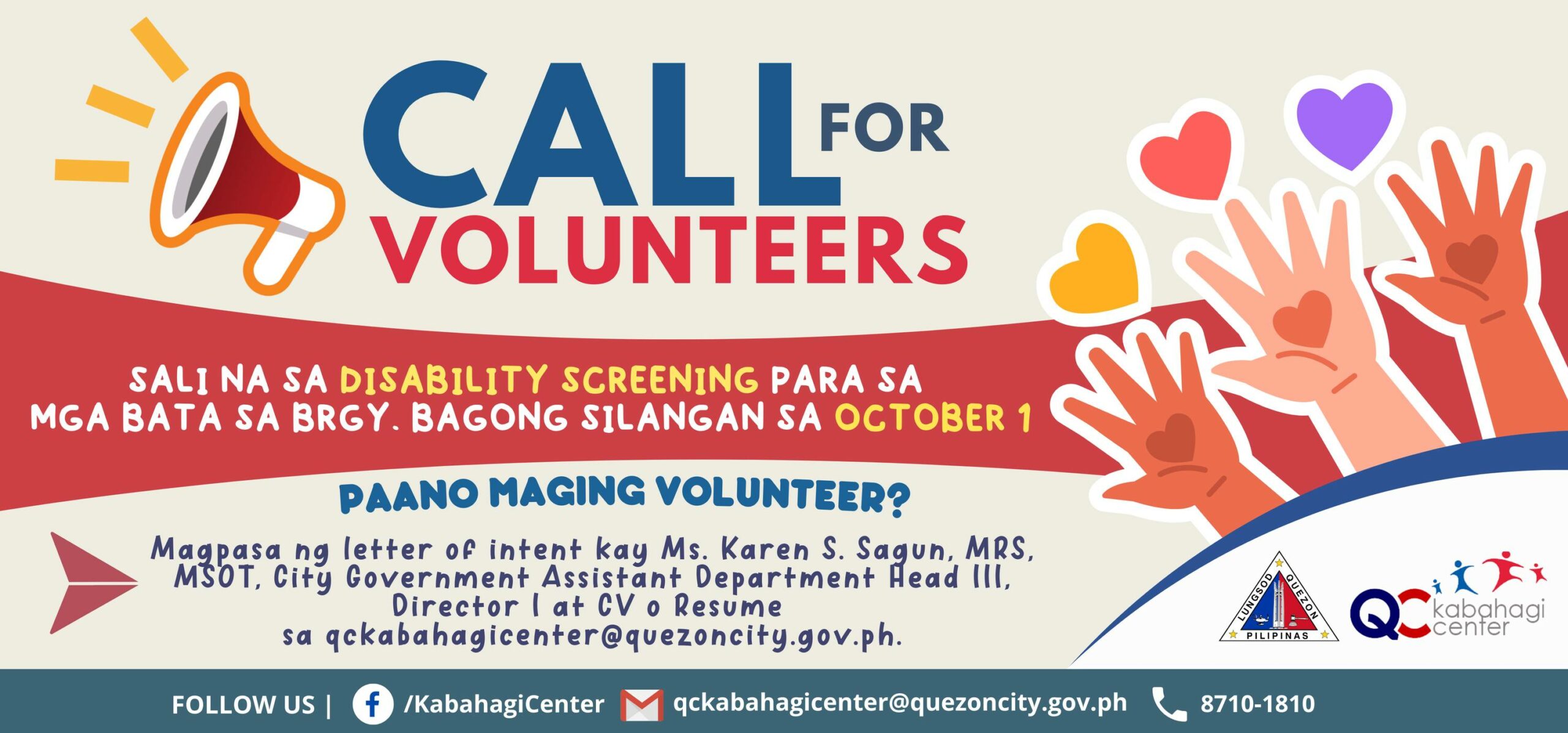 Para sa mga interesadong maging volunteer, magpasa ng letter of intent at resume sa qckabahagicenter@qcwebsite.sparksoft-demo.com.
