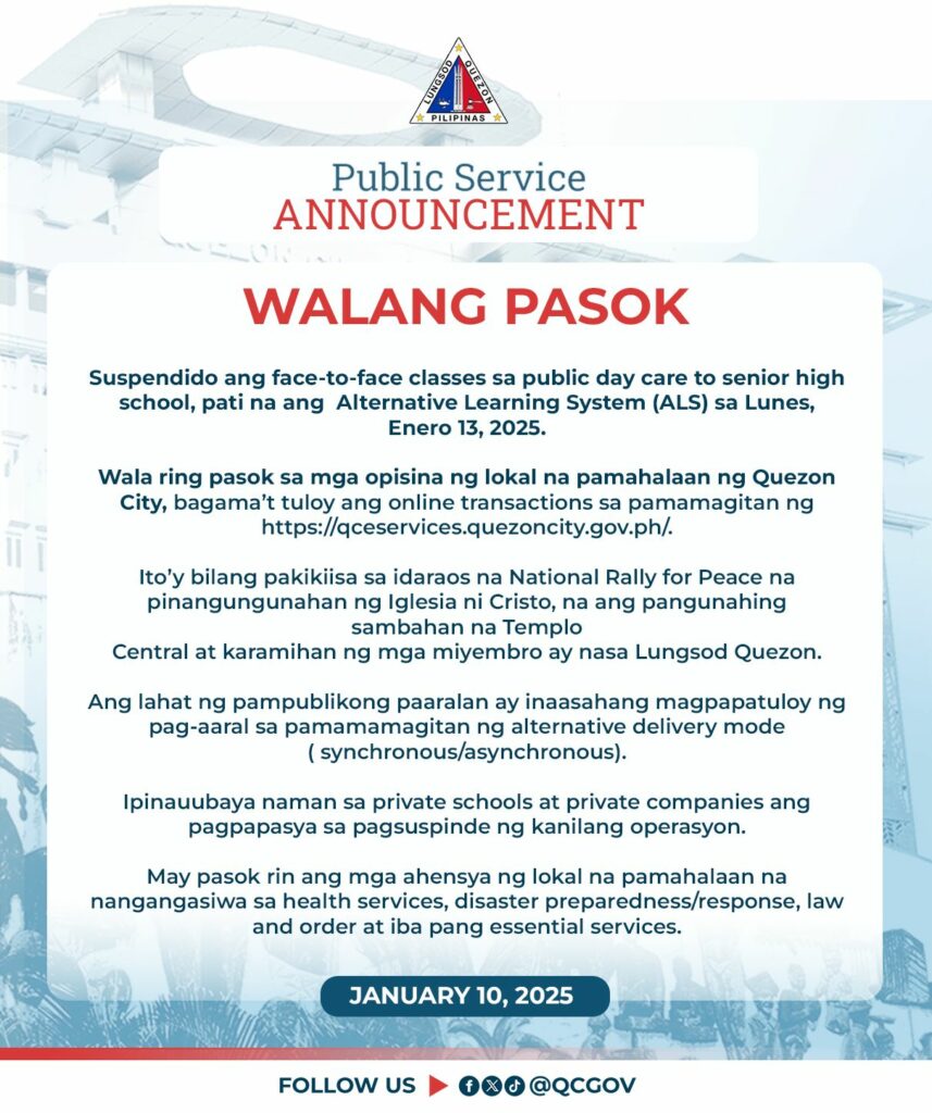 Suspendido ang face-to-face classes sa public day care to senior high school, pati na ang Alternative Learning System (ALS) sa Lunes, Enero 13, 2025.