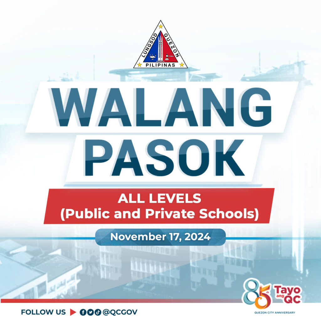 #WALANGPASOK | Dahil sa itinaas na Tropical Cyclone Wind Signal No. 2 sa Metro Manila, inirekomenda ng Quezon City Disaster Risk Reduction and Management Council (QCDRRMC) na walang pasok sa mga public at private colleges at universities sa Quezon City bukas, November 17, 2024.
