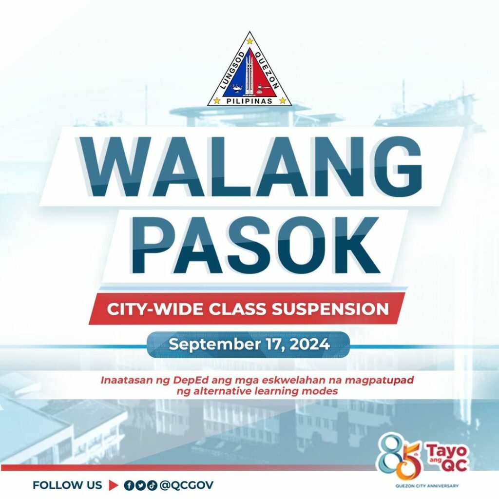 #WALANGPASOK | Alinsunod sa DepEd Order No. 37, s. 2022 at Local Government Memorandum Circular No. 10-A s. 2022, walang pasok sa mga pampubliko at pribadong paaralan mula Daycare hanggang Senior High School sa Quezon City ngayong September 17, 2024.