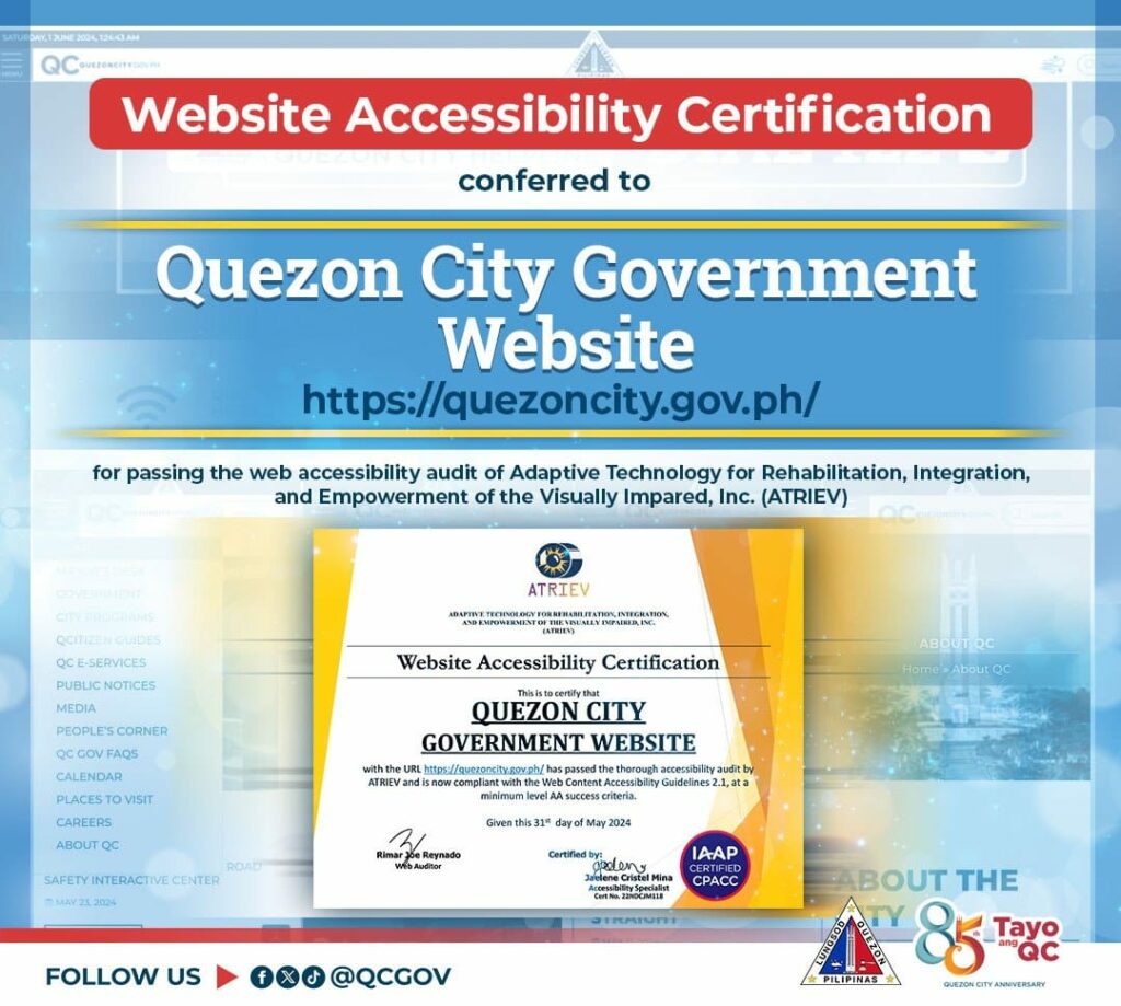 Nakatanggap ng Website Accessibility Certification ang Quezon City Government Website matapos makapasa sa web accessibility audit ng Adaptive Technology for Rehabilitation, Integration, and Empowerment of the Visually Impared, Inc. (ATRIEV).